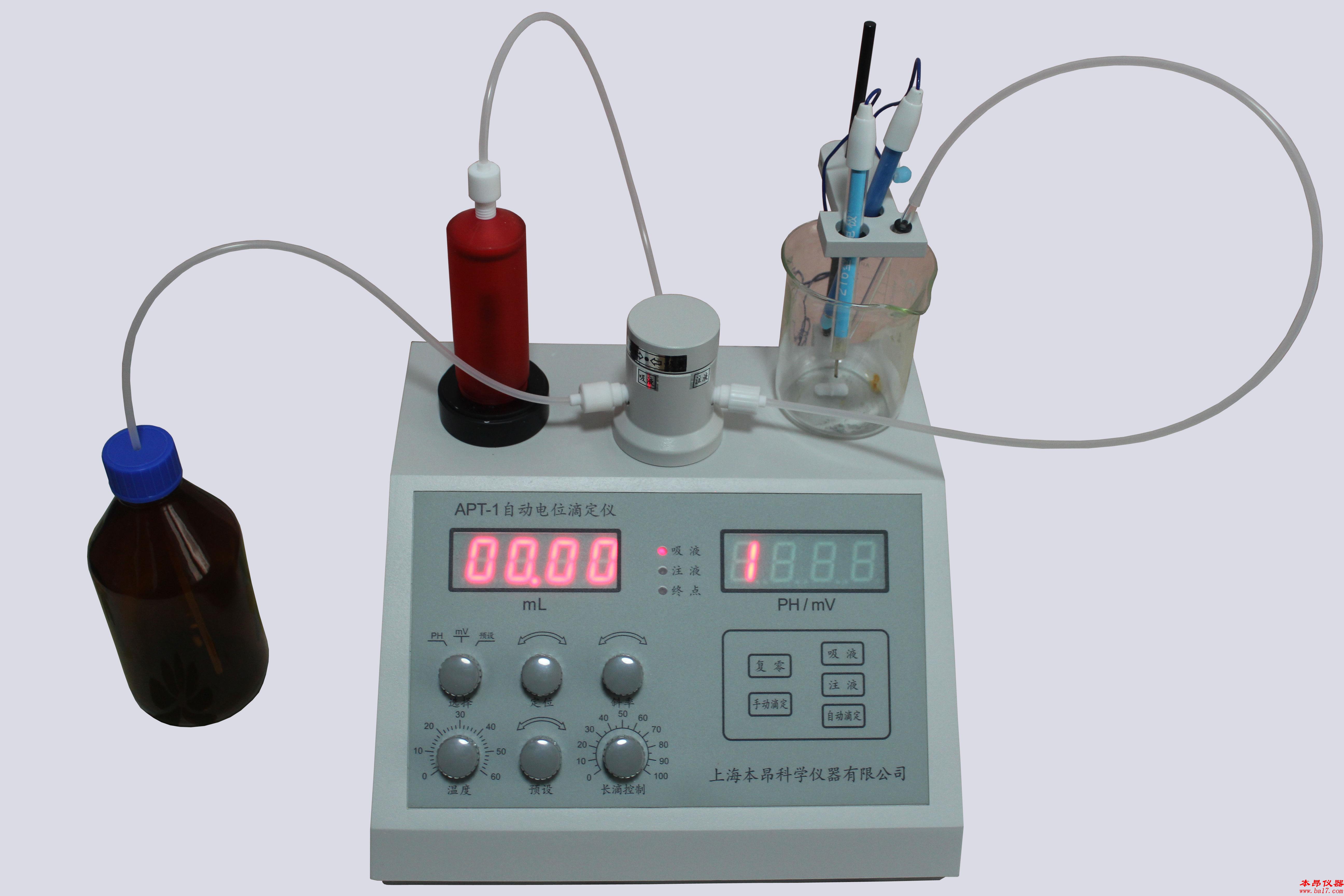 上海本昂科學(xué)儀器有限公司生產(chǎn)的APT-1自動(dòng)電位滴定儀(APT-1 Automatic potentiometric titrator)可用于水相/非水相酸堿滴定、氧化還原滴定、沉淀滴定(銀量法滴定)、絡(luò)合滴定和酸值的測定,標(biāo)配復(fù)合電極,可用于水相或化學(xué)品的酸度和堿度測定,牛奶、果汁、油脂和酒等食品的酸值檢測,并能測量pH值和離子濃度;標(biāo)配PH玻璃電極可用于非水相和強(qiáng)腐蝕性樣品的酸度和堿度測定,并能測量pH值和離子濃度;標(biāo)配銀電極和銀-氯化銀參比電極,可用于沉淀滴定,如氯離子含量、溴離子含量、銀含量、硫化物和硫醇含量等檢測;標(biāo)配鉑電極,可用于氧化還原滴定,如二氧化硫含量、還原糖含量、過氧化值和維生素C含量等檢測。