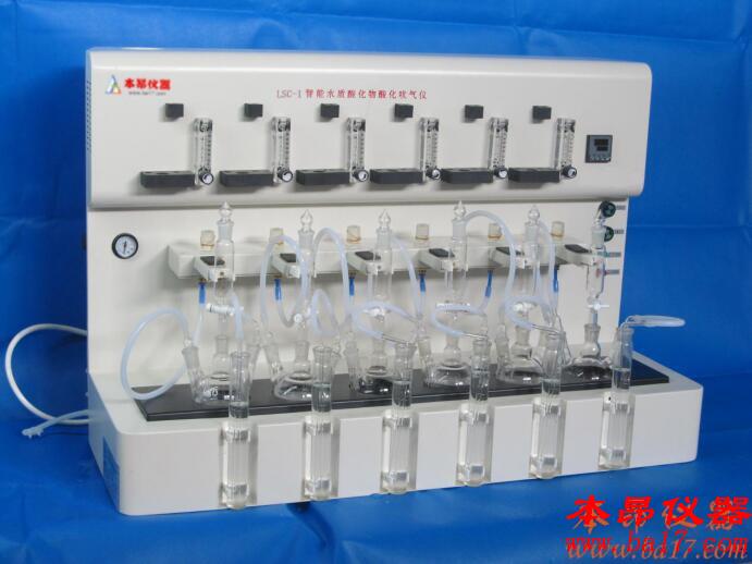 LSC-1智能水質(zhì)硫化物酸化吹氣儀是上海本昂科學(xué)儀器有限公司根據(jù)中華人民共和國標(biāo)準(zhǔn)GB/T16489-1996《水質(zhì)硫化物的測定--亞甲基藍(lán)分光光度法》和《HJ/T 60-2000 水質(zhì)硫化物的測定 碘量法》量身定做的一款專門用于檢測水中硫化物的前處理儀器。該儀器采用垂直加酸、氮?dú)獯得?、酸化吸收等一體化設(shè)計,一次可處理1-6組樣品。每個單元采用獨(dú)立的轉(zhuǎn)子流量計控制氮?dú)饬魉?;PID加熱控溫程序,自動升溫至設(shè)定溫度,缺水自動報警,自動補(bǔ)水;外置式平板電腦遙控操作等程序?qū)崿F(xiàn)了對水質(zhì)硫化物測定的智能預(yù)處理。完全滿足樣品前處理的需要。適用于環(huán)保、科研、水文等單位的土壤、海水、湖泊、地面水、地下水、生活污水和工業(yè)廢水中硫化物的測定。LSC-1智能水質(zhì)硫化物酸化吹氣儀具有便捷控制、操作簡便、快捷、嚴(yán)格按照國標(biāo)執(zhí)行等特點(diǎn)。