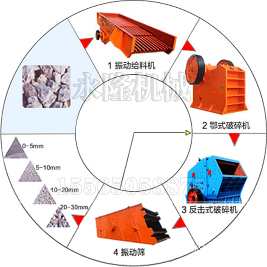 碎石主要由振動(dòng)給料機(jī)、顎式破碎機(jī)、反擊式破碎機(jī)、振動(dòng)篩、膠帶輸送機(jī)、集中電控等設(shè)備組成。